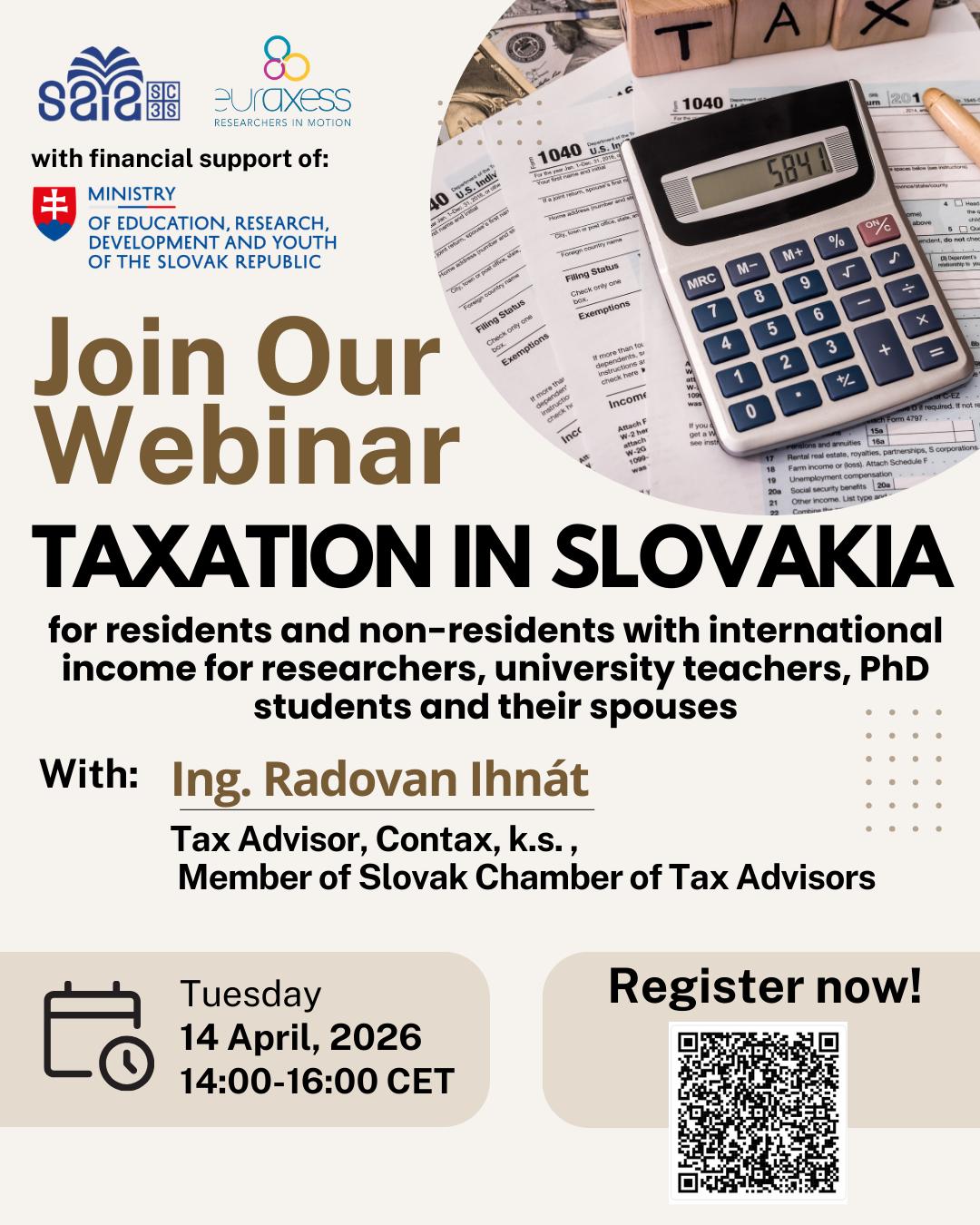 V mene SAIA Vás srdečne pozývame na online webinár "Zdanenie na Slovensku pre rezidentov a nerezidentov so zahraničnými príjmami pre výskumných pracovníkov, vysokoškolských učiteľov, doktorandov a ich manželov".